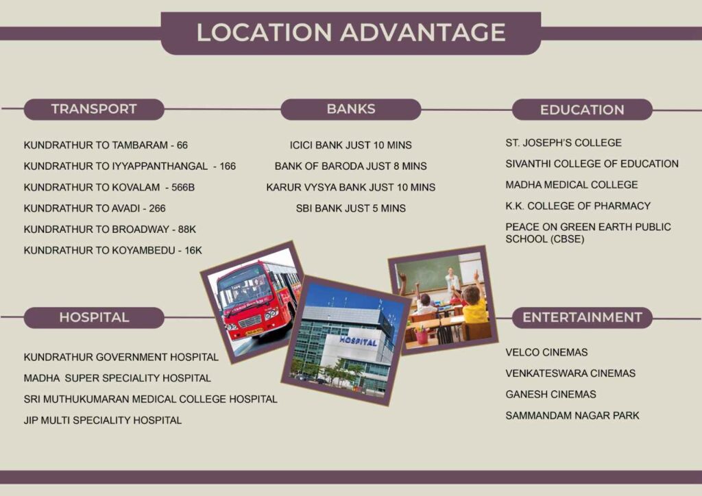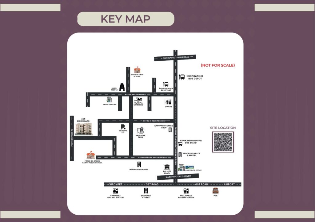 ACS Benchmark enjoys excellent location advantages, with seamless connectivity to Kundrathur Road, Pammal, Pallavaram, Chromepet, GST Road, and Chennai International Airport. Reputed schools, colleges, hospitals, banks, supermarkets, entertainment zones, and public transport facilities are all located nearby, making daily commuting effortless.