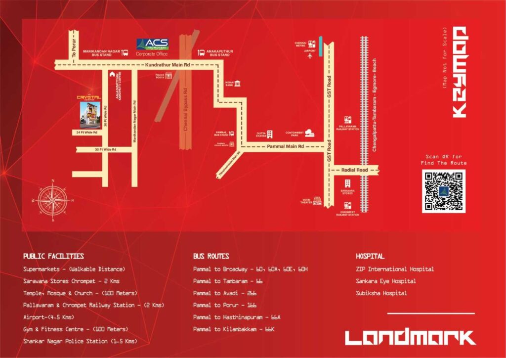 The project enjoys excellent location advantages, with seamless connectivity to Kundrathur Road, Pammal, Pallavaram, Chromepet, GST Road, and Chennai International Airport. Supermarkets, schools, hospitals, fitness centres, temples, railway stations, and public transport facilities are all located nearby, making everyday commuting easy and stress-free.