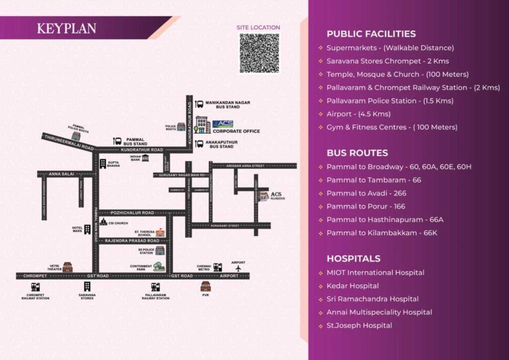 ACS Glorious enjoys excellent location advantages, with close proximity to Kundrathur Road, Pallavaram, Chromepet, and Chennai International Airport. Leading schools, hospitals, supermarkets, temples, public transport facilities, and railway stations are all located nearby, making everyday commuting simple and stress-free. This strategic connectivity makes the project ideal for both end-users and investors.