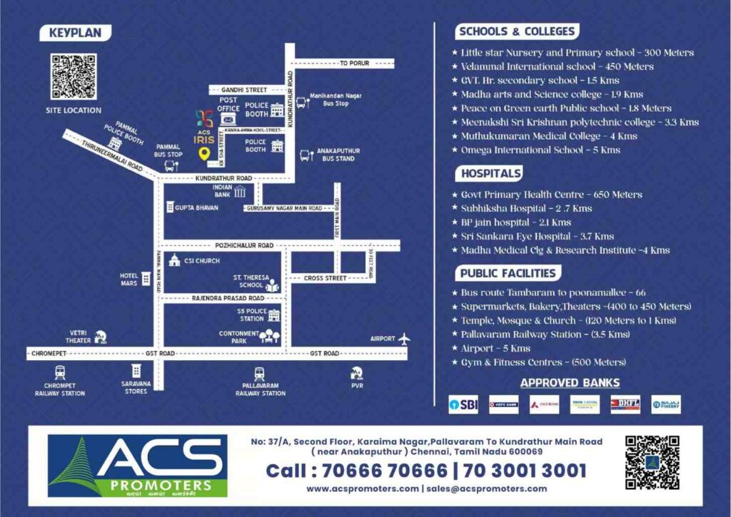 ACS Iris is a thoughtfully planned residential apartment project by ACS Promoters, located in the well-established residential locality of Anakaputhur. The project offers premium 2 BHK apartments, ideal for families seeking modern living, strong connectivity, and long-term investment value.